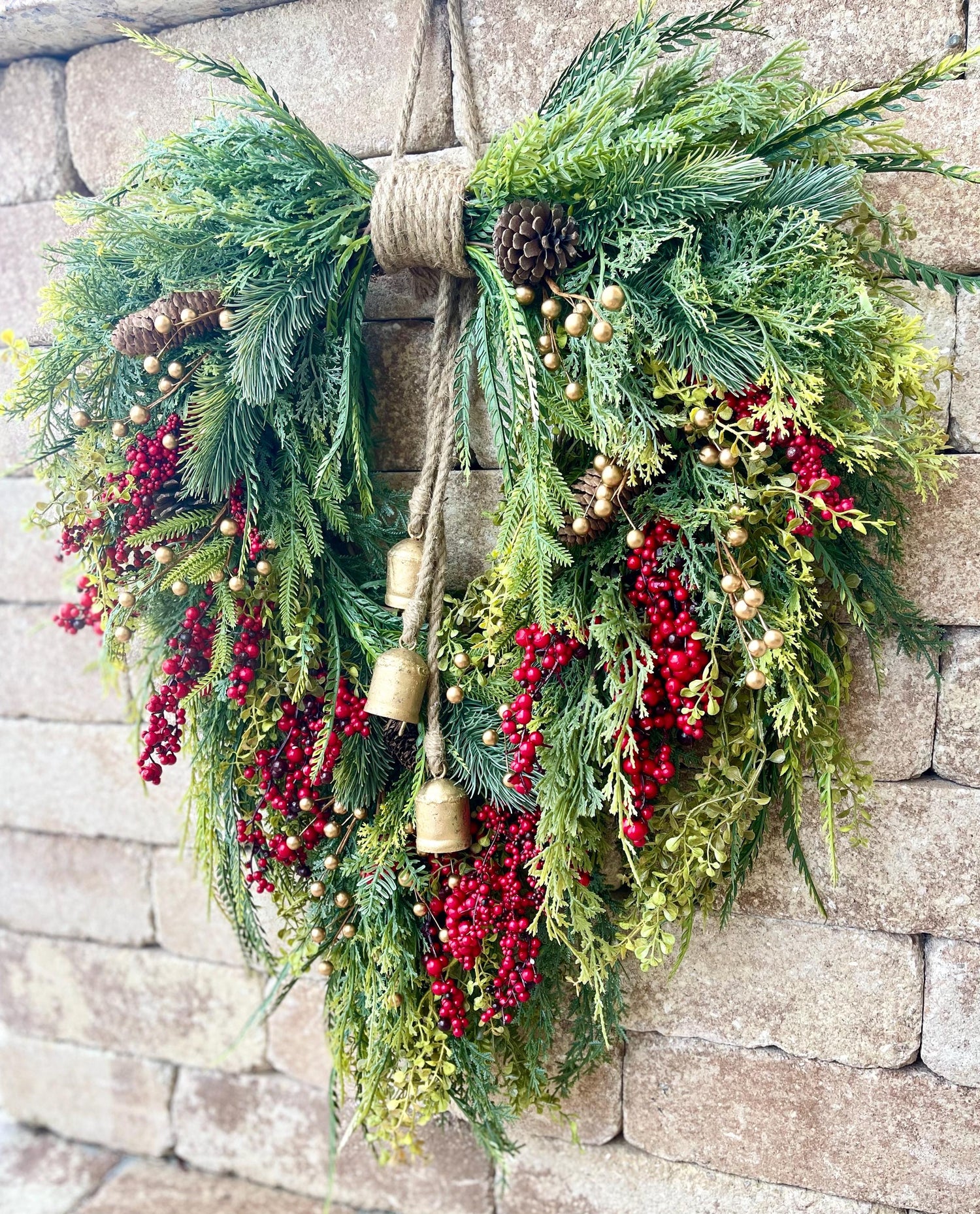 Red Berry Christmas Wreath, Rustic Farmhouse Evergreen, Velvet Bow