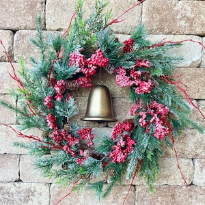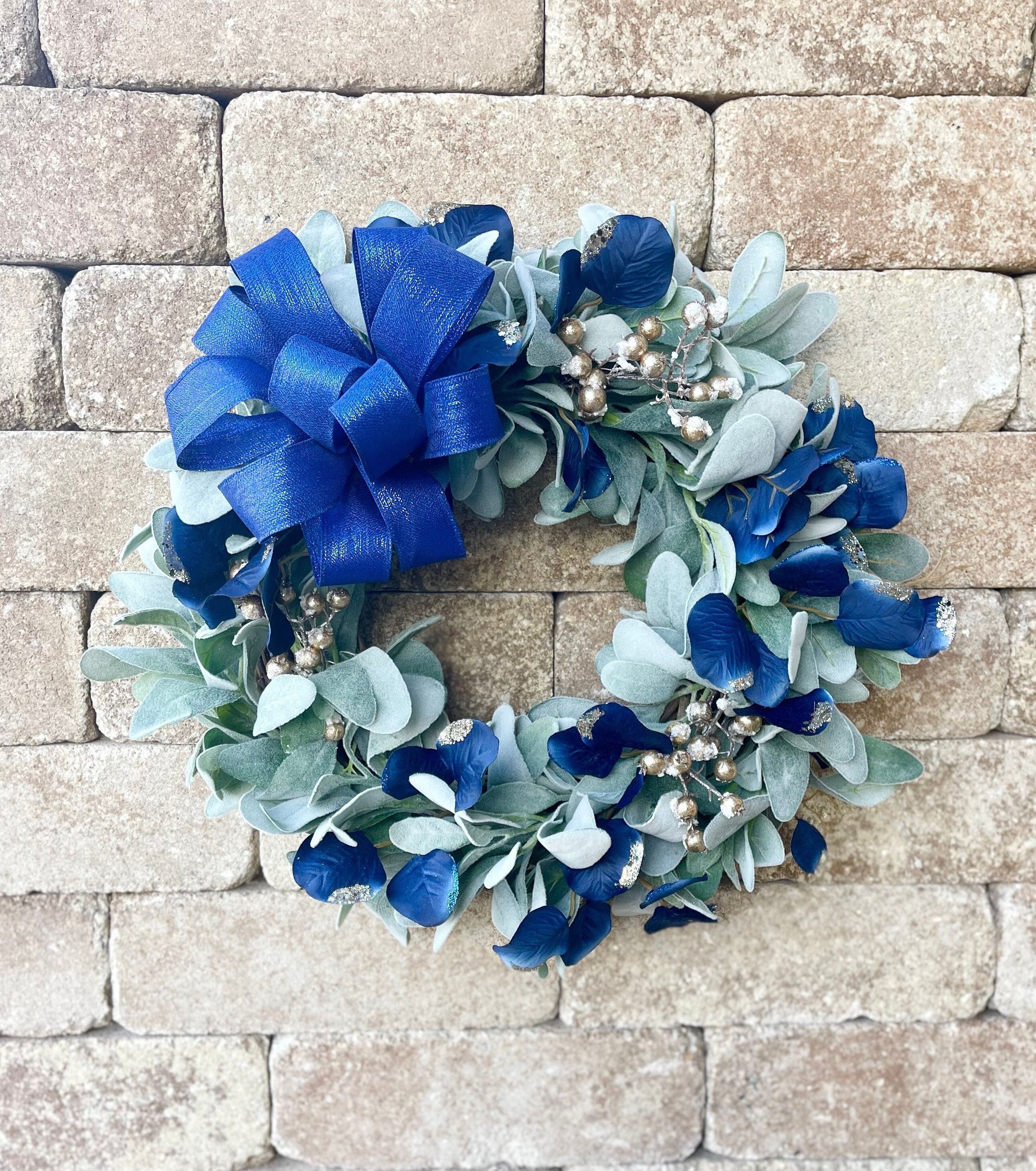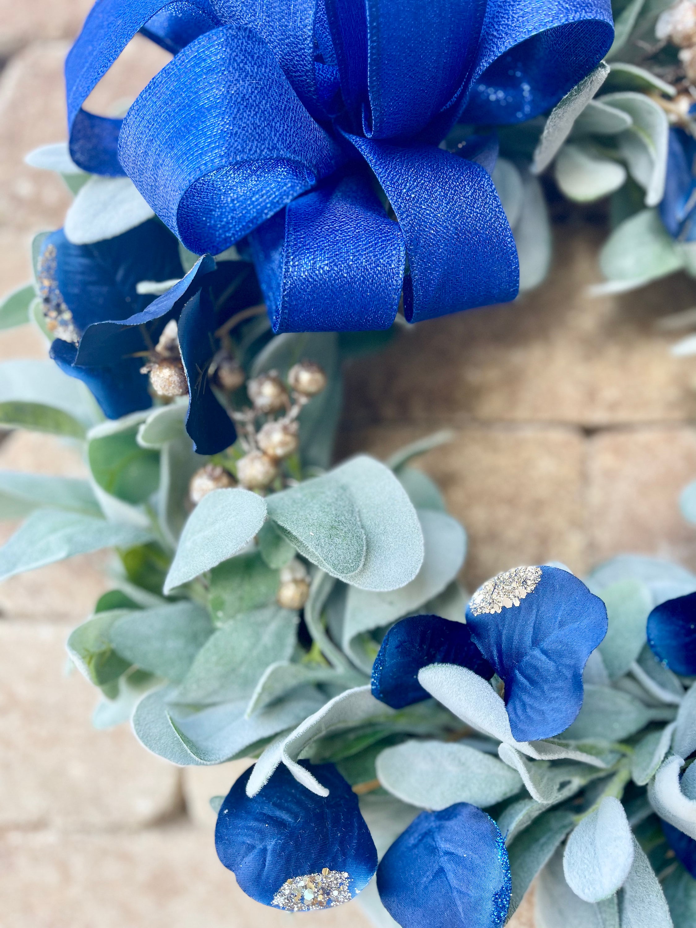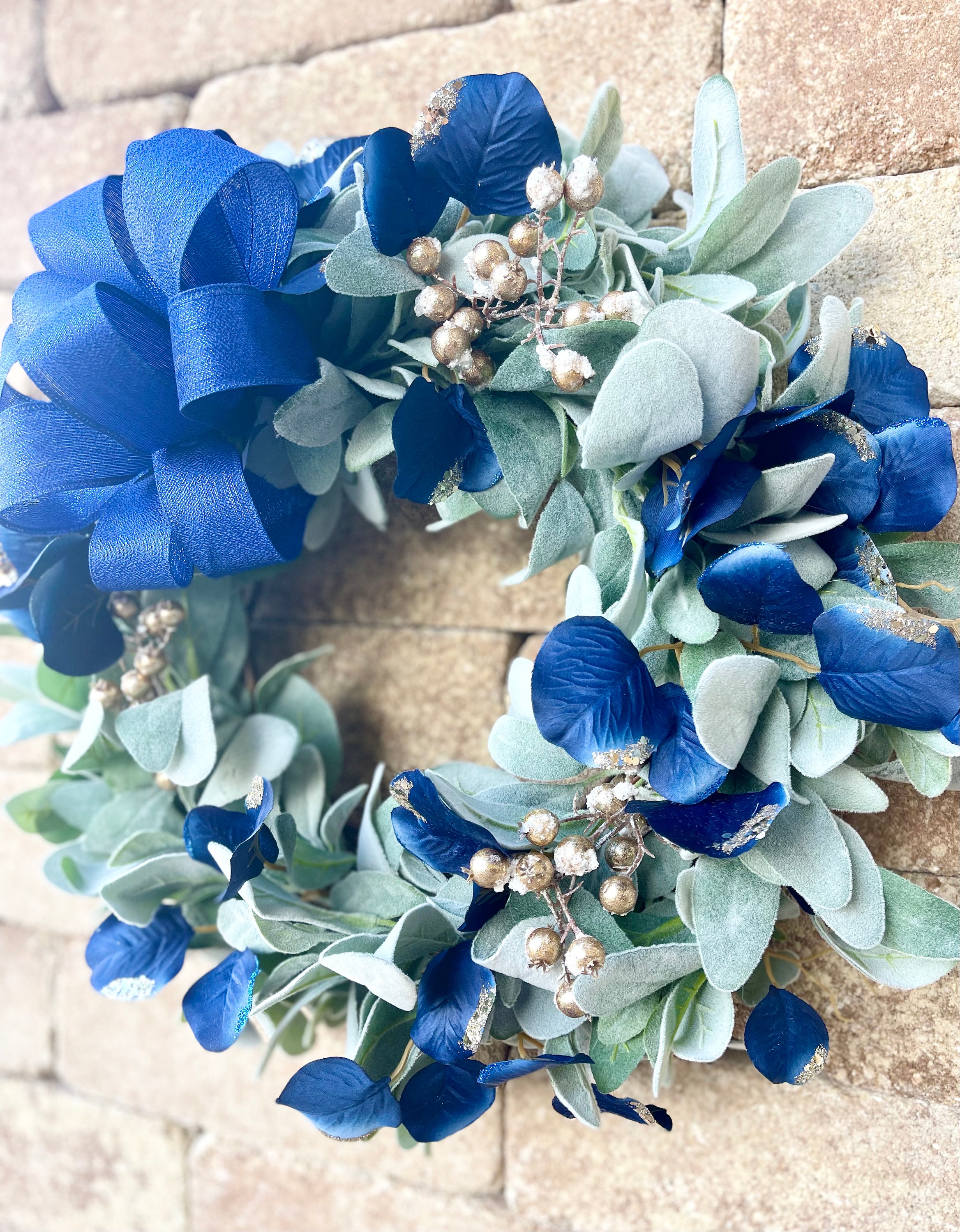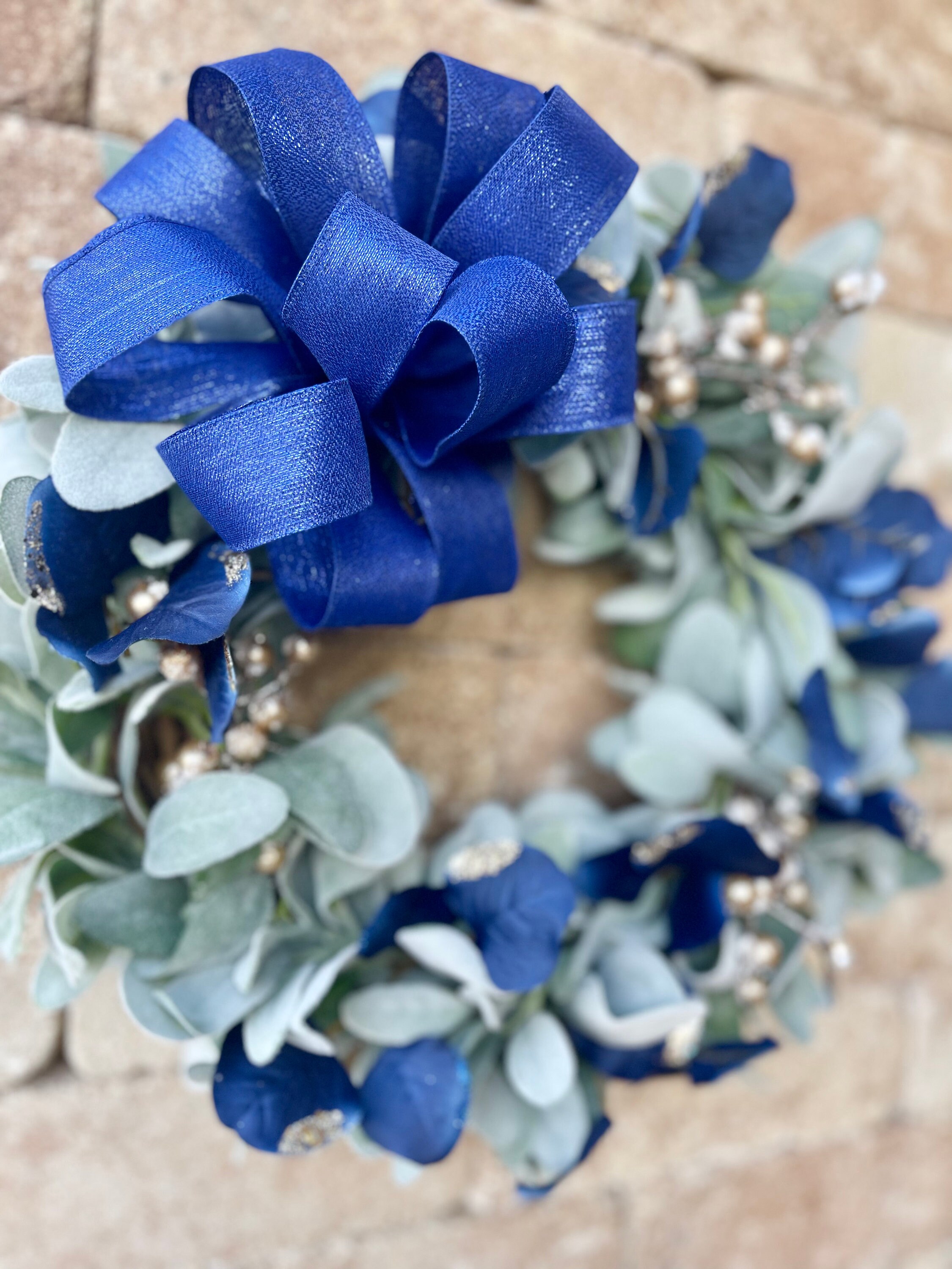 This royal blue eucalyptus lamb's ear Christmas wreath is perfect for your front door this holiday season! This navy seasonal decor features high quality, artificial lamb's ear greenery, blue dollar eucalyptus dipped in golden glitter, sparkly golden berries with white frost, and a vibrant blue bow on a 14" (pictured) or 18" grapevine wreath form. This blue winter wonderland Christmas wreath would look great on any front door, entryway, hallway, or an outdoor holiday gathering. With decor, the pictured Christmas wreath measures approximately 19" in diameter and 5" deep leaf tip to leaf tip. A larger versions of this wreath are offered on an 18" grapevine wreath form, measuring approximately 23" in diameter, and 5" deep.