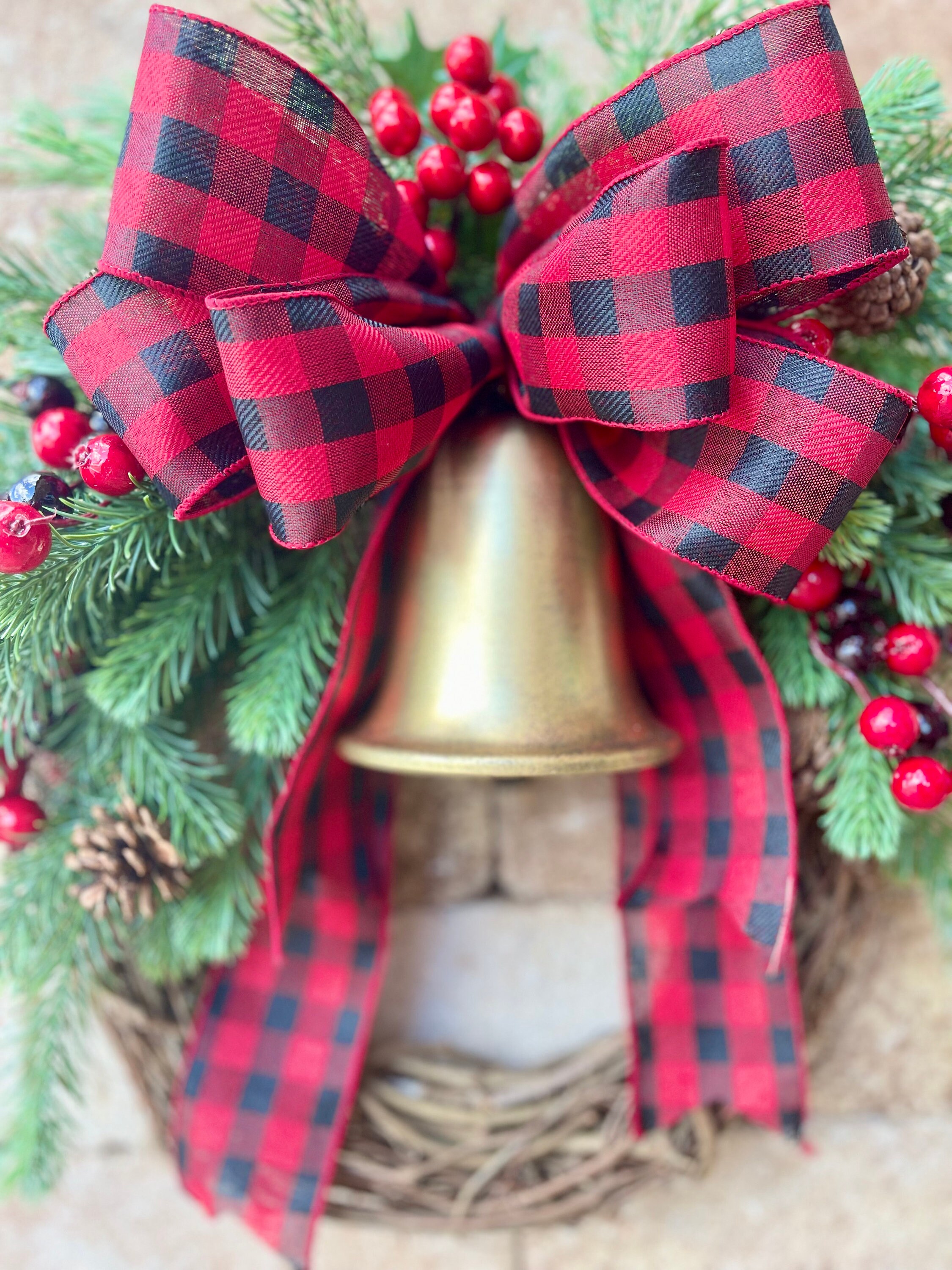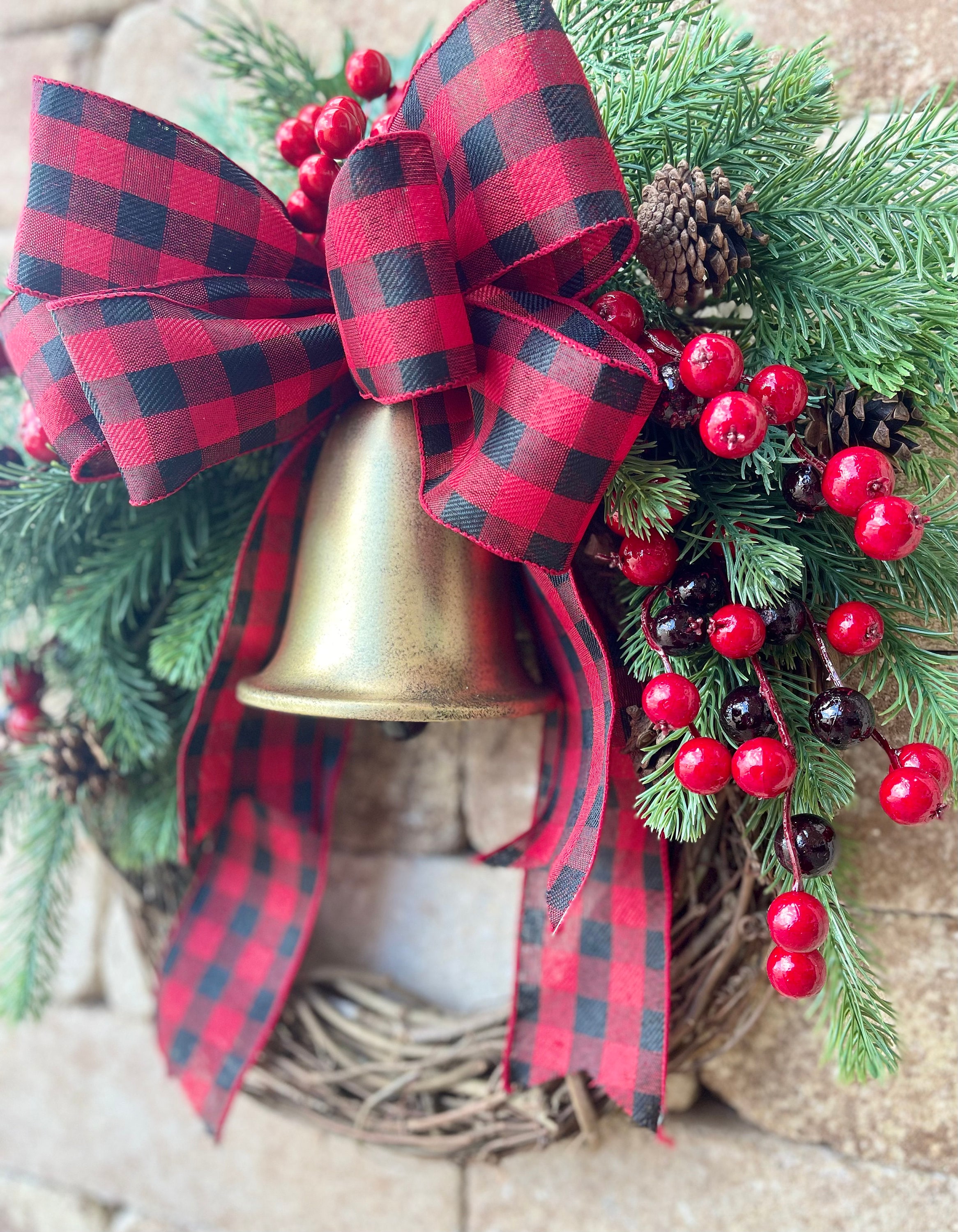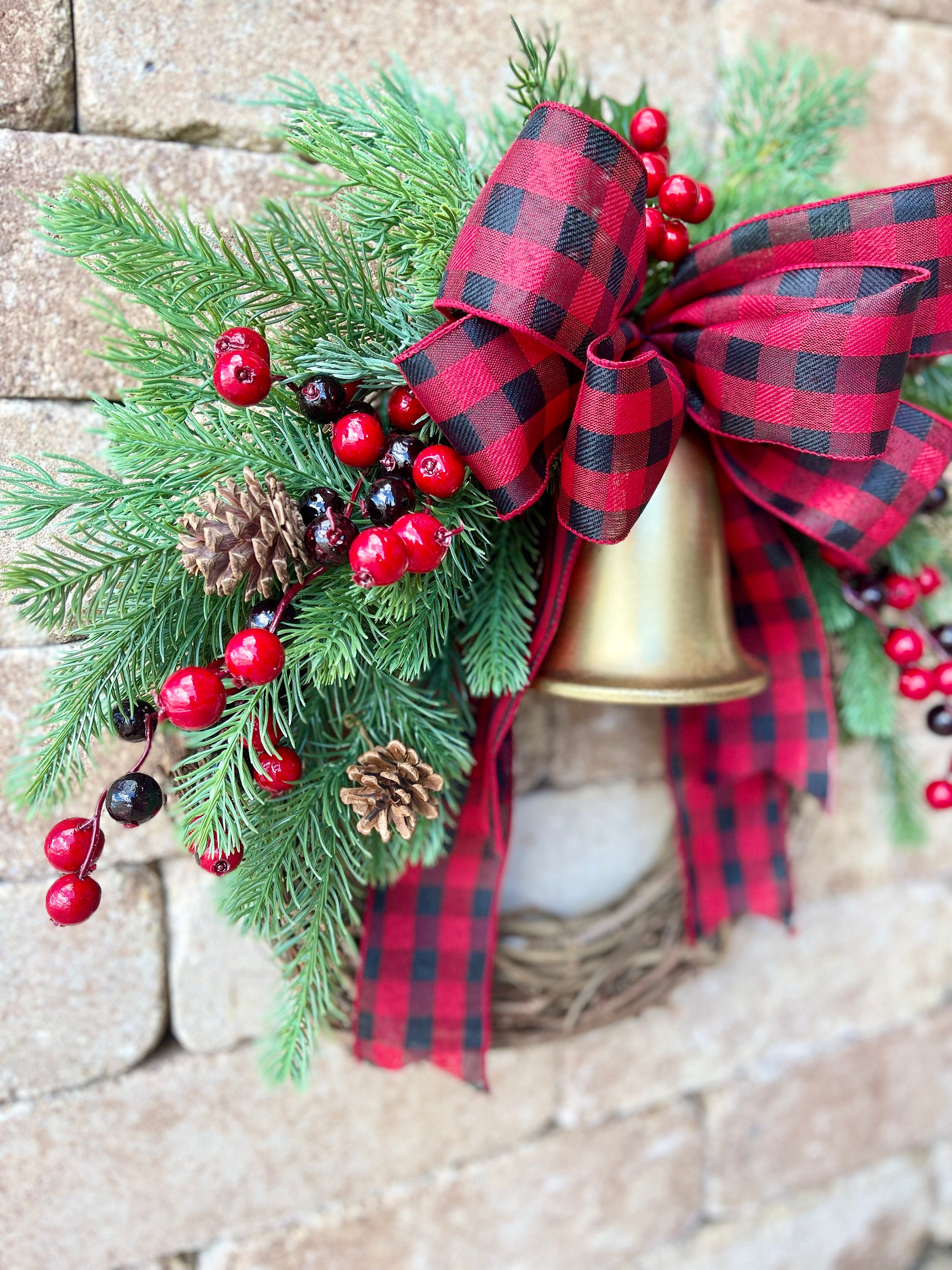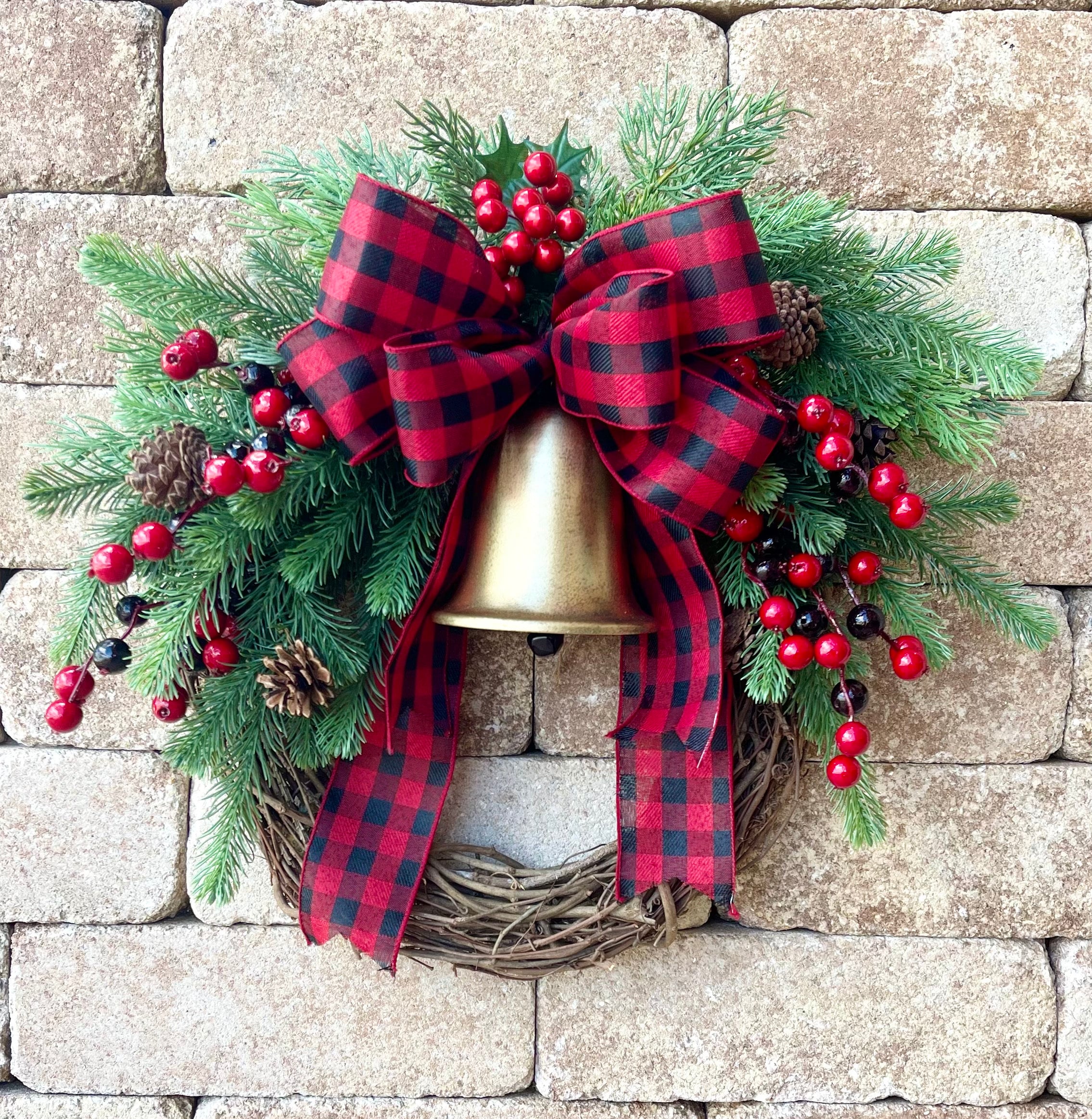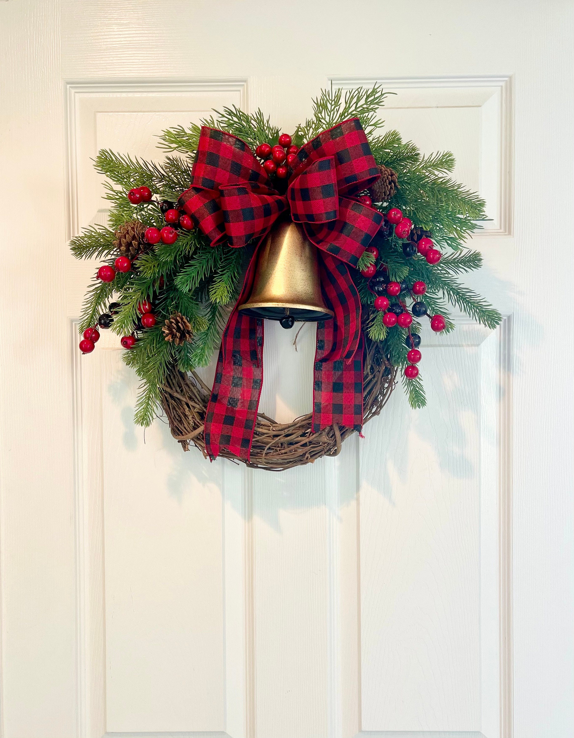 This classic evergreen pine and red berries Christmas wreath is perfect for your front door this holiday season!  This simple, traditional wall seasonal decor features high quality, artificial evergreen pine greenery, faux pinecones, faux red berries, a buffalo check red bow, and a golden Christmas bell on a 14" (pictured) or 18" grapevine wreath form. This elegant cedar winter Christmas wreath accent would look great on any front door, entryway, hallway, or an outdoor holiday gathering. With decor, the pictured country farmhouse Christmas wreath measures approximately 19" in diameter and 5" deep leaf tip to leaf tip. A larger version of this wreath is available in 23" diameter.