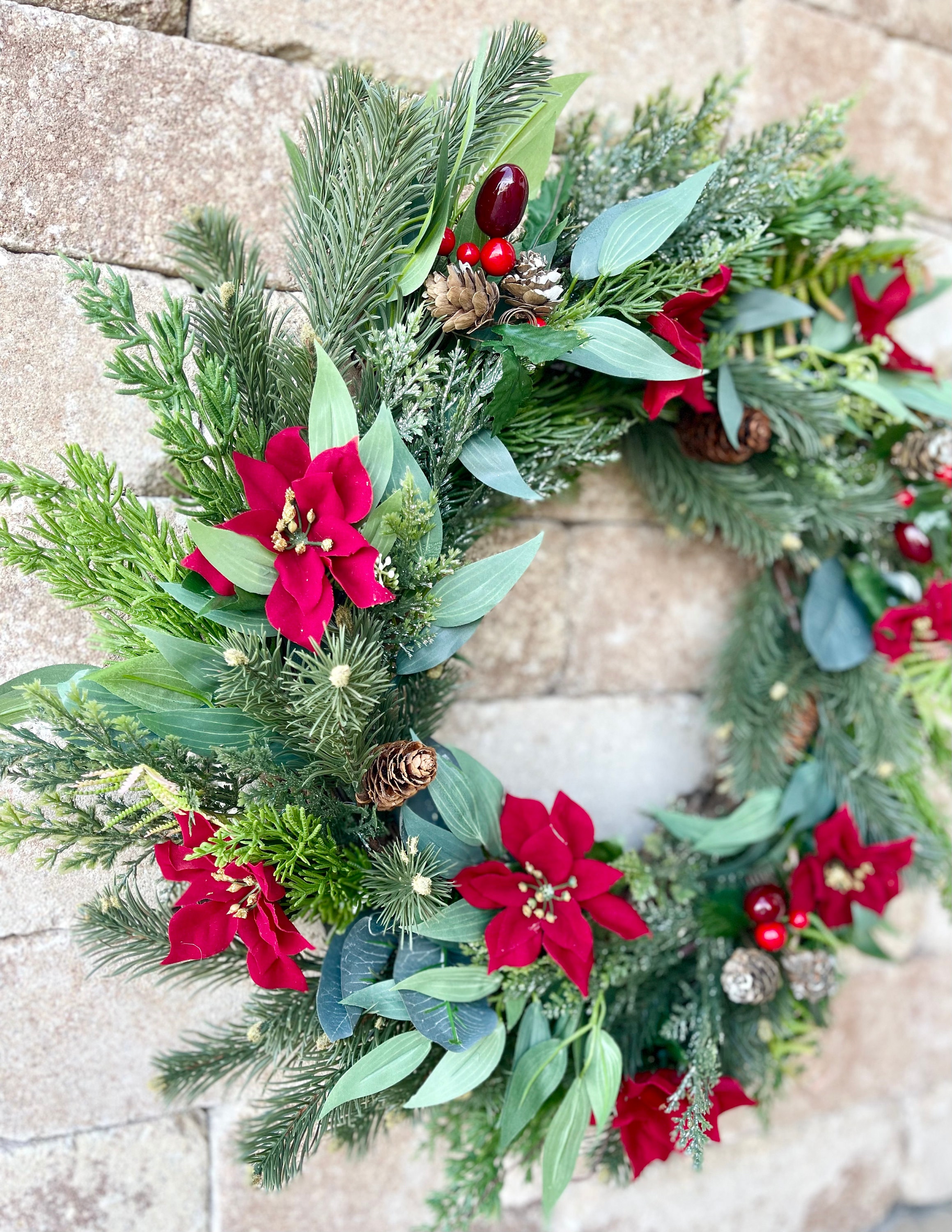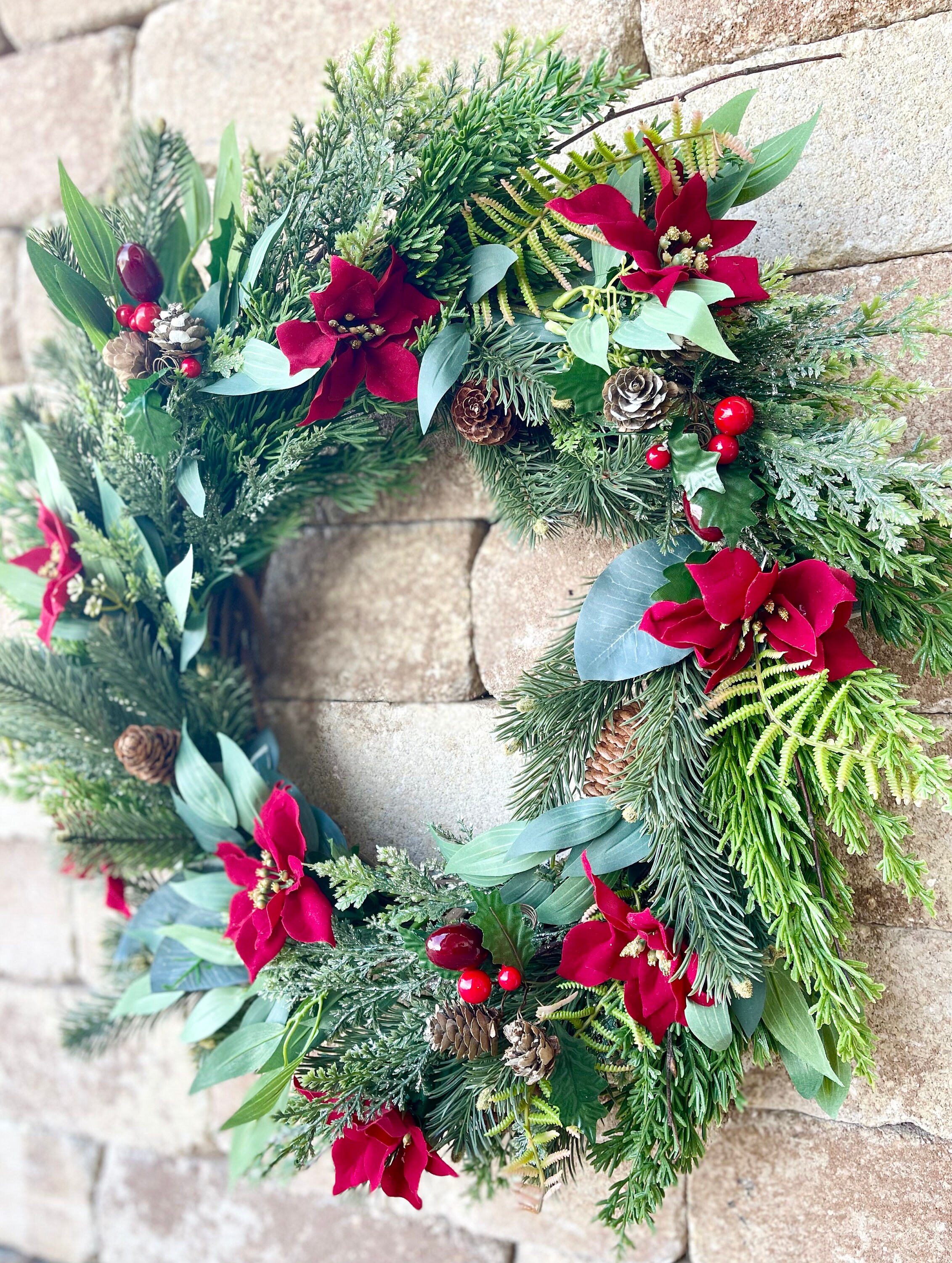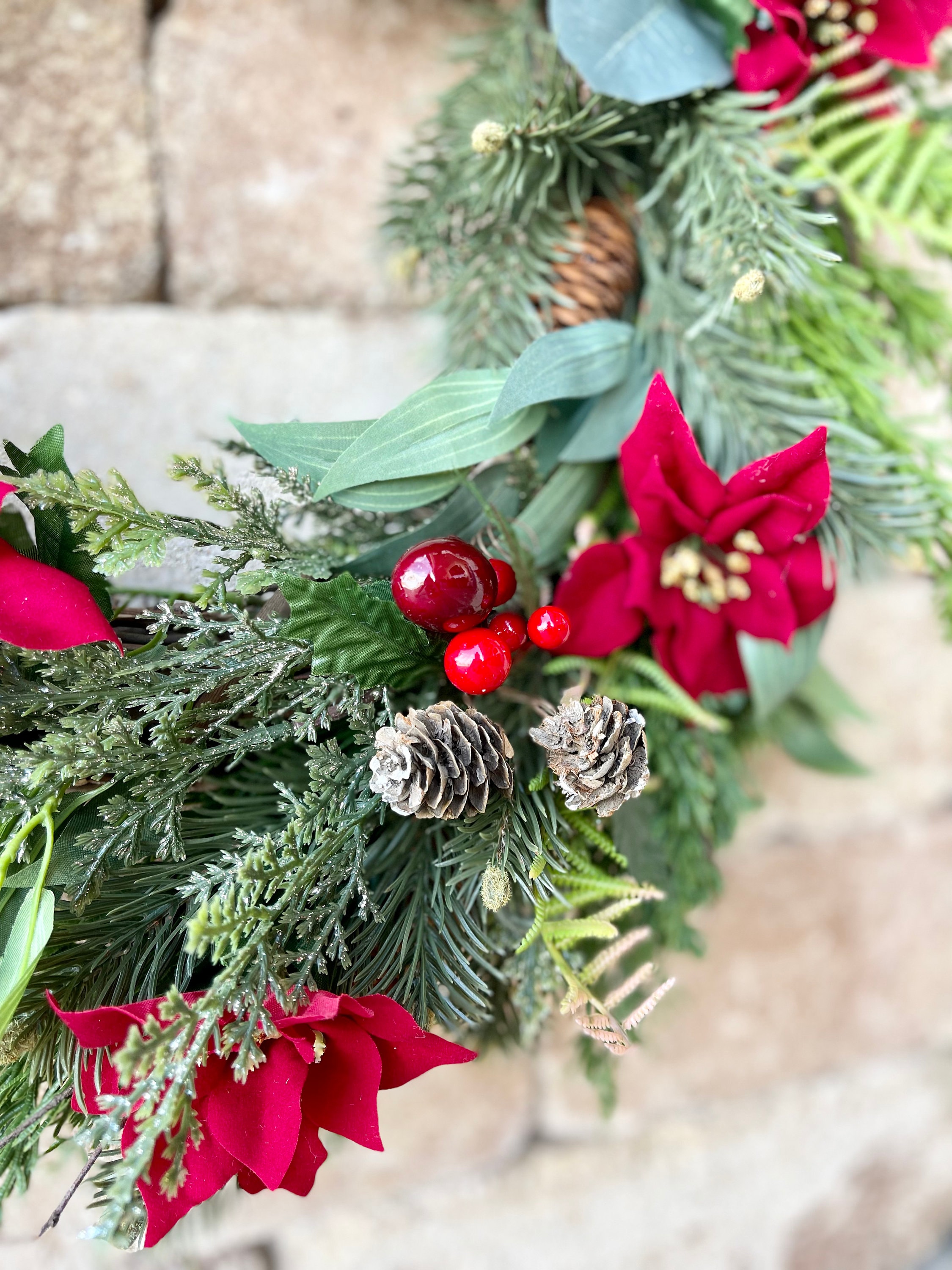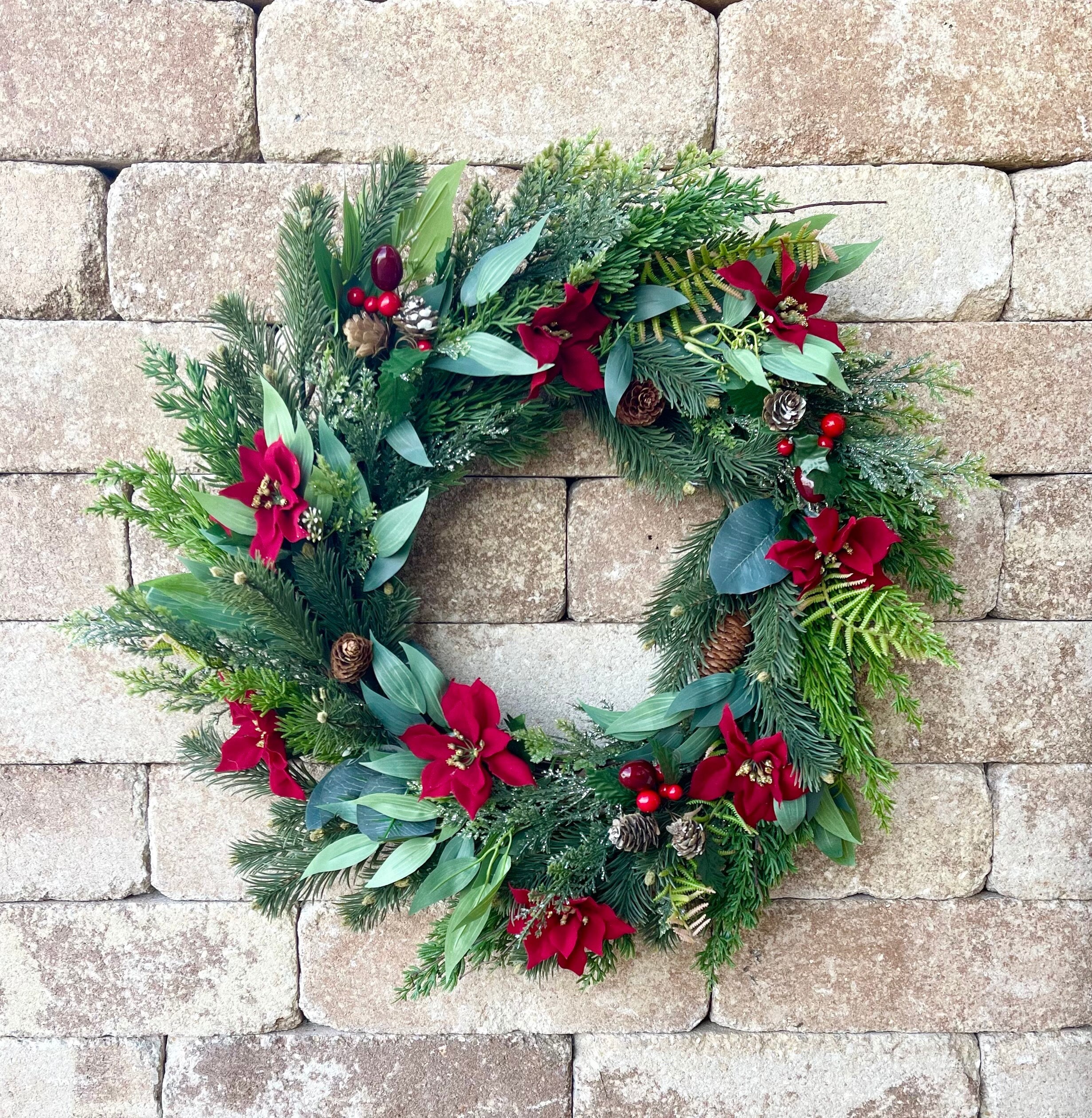 This classic red poinsettia and mixed evergreen Christmas wreath is perfect for your front door this holiday season! This traditional pine and red poinsettia seasonal wall decor features a variety of evergreen pine greenery, faux red berries, ferns, faux greenery, small pinecones and red glittery poinsettia florals on a 14" (pictured) or 18" grapevine wreath form. This elegant winter Christmas wreath accent would look great on any front door, entryway, hallway, or an outdoor holiday gathering. With decor, the pictured red and green Christmas wreath measures approximately 21" in diameter and 5" deep leaf tip to leaf tip. A larger version of this wreath is available measuring approximately 25" in diameter and 5" deep.