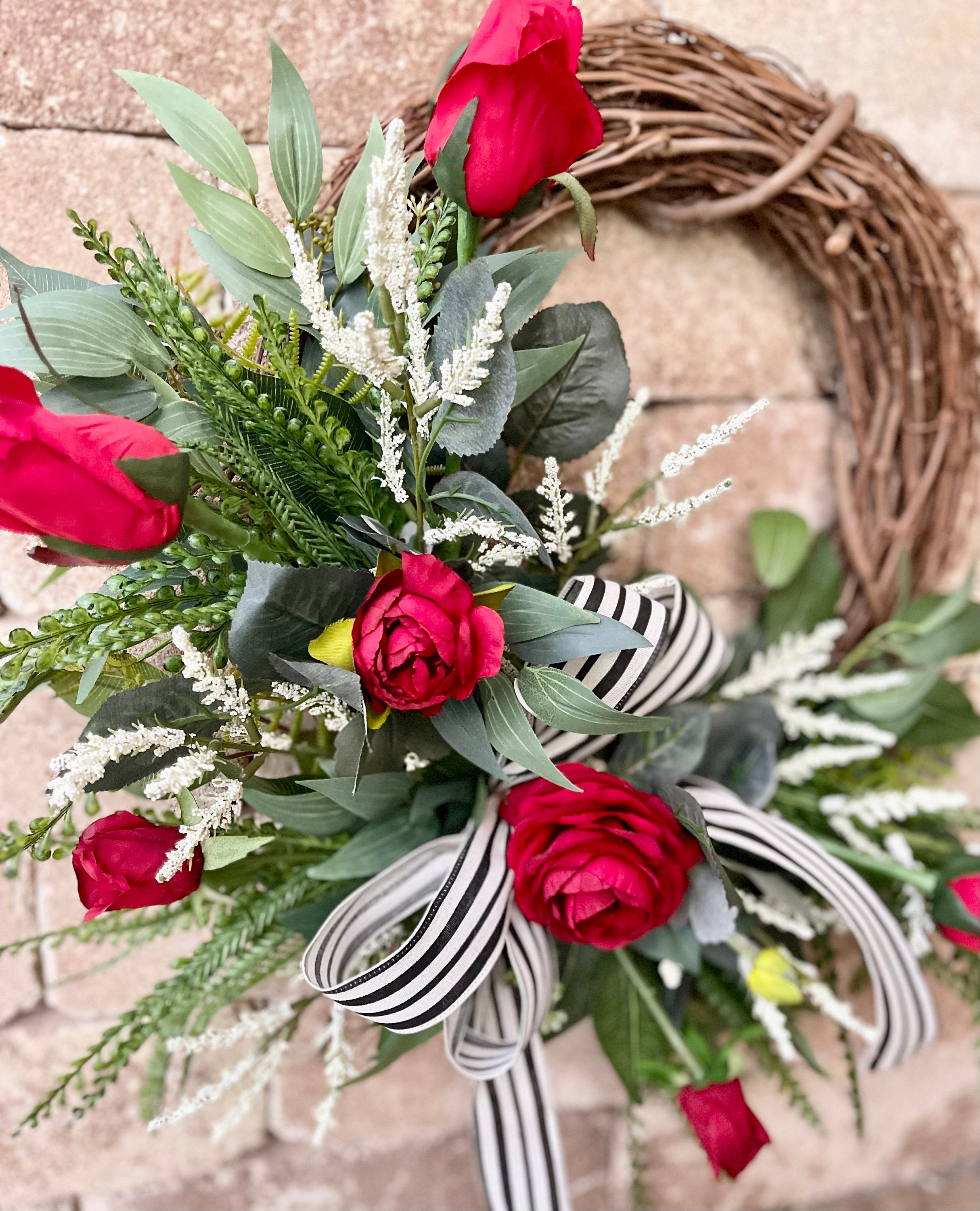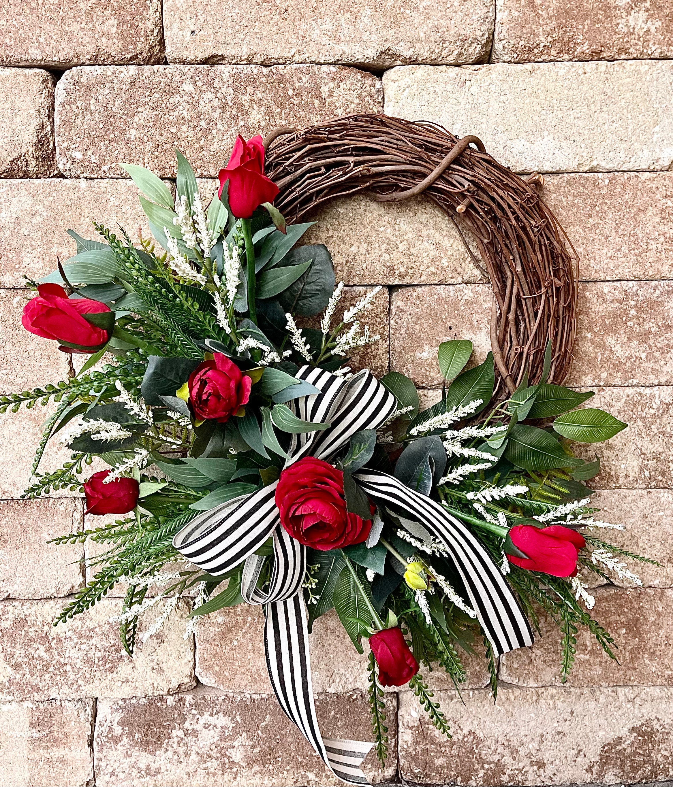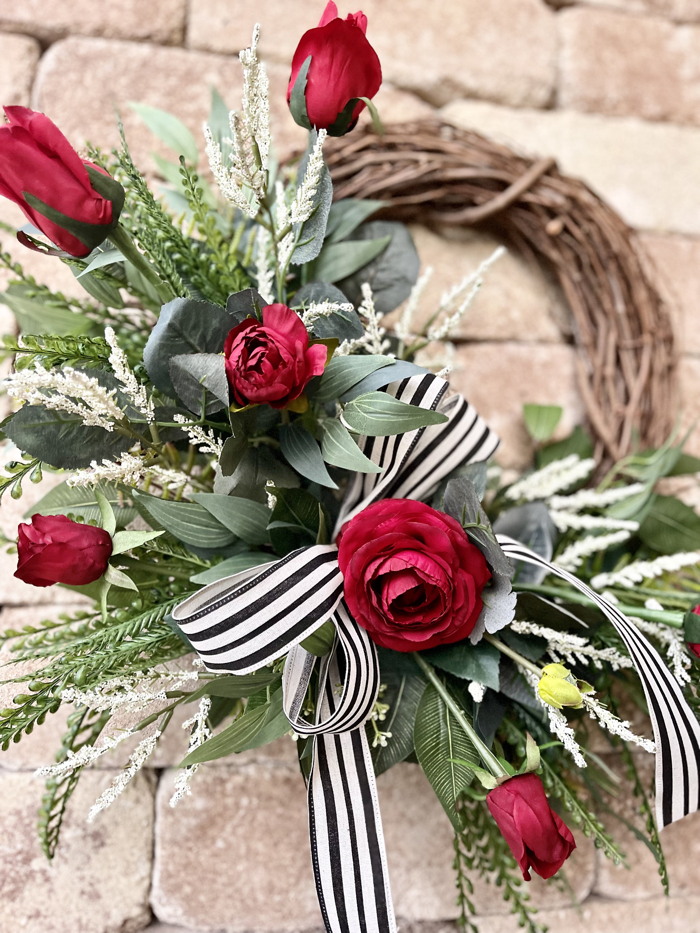 Celebrate love and elegance this Valentine’s Day with this stunning handmade wreath, featuring vibrant roses and ranunculus in your choice of romantic red or soft pink. Accented with delicate white berries, this wreath is the perfect way to welcome guests and set a festive tone for your home.