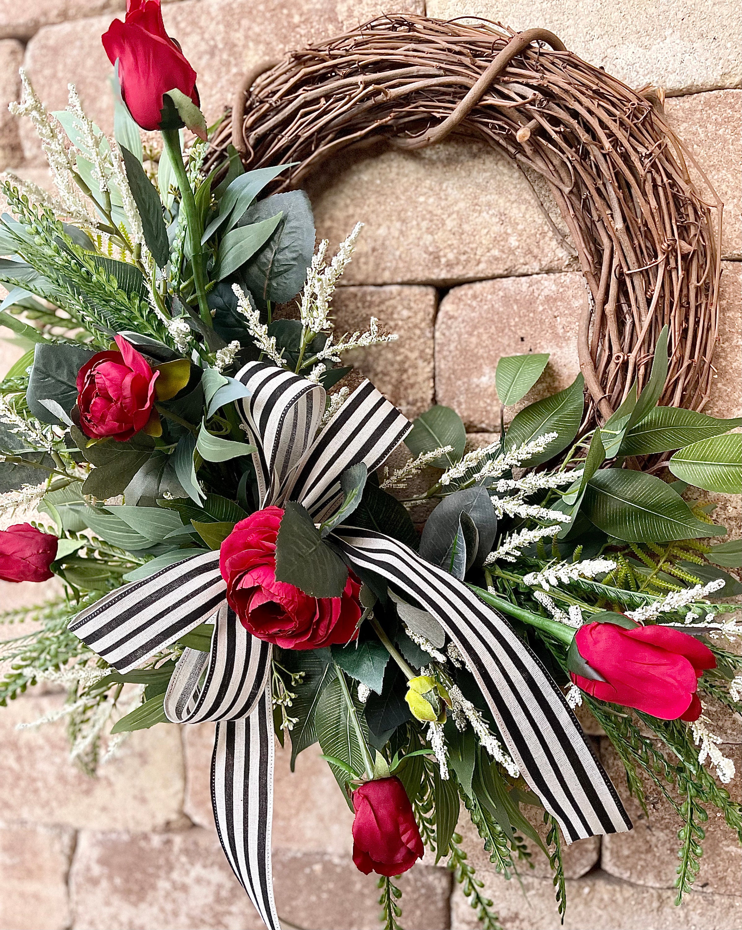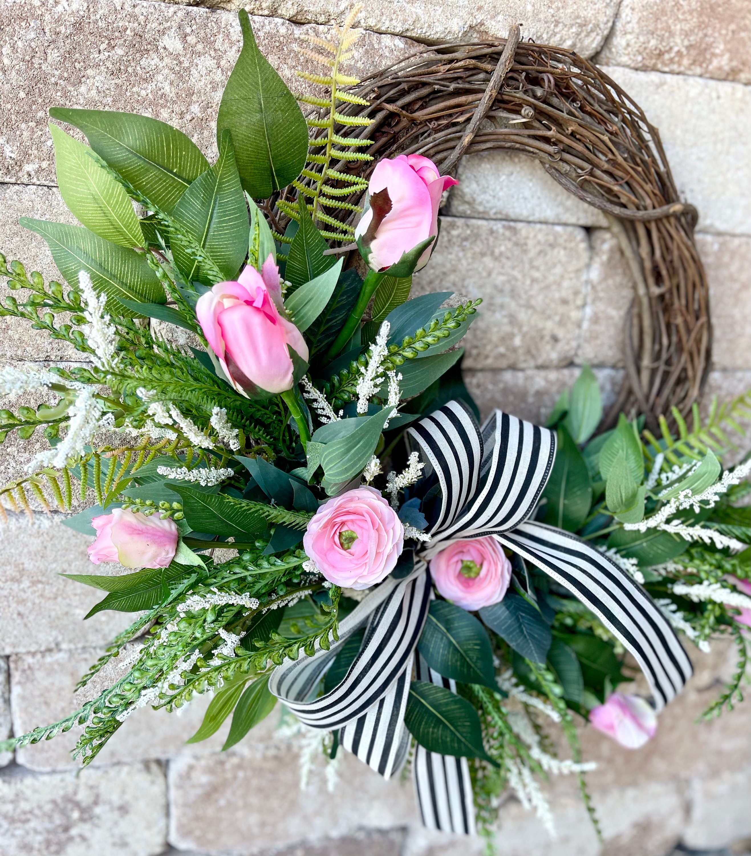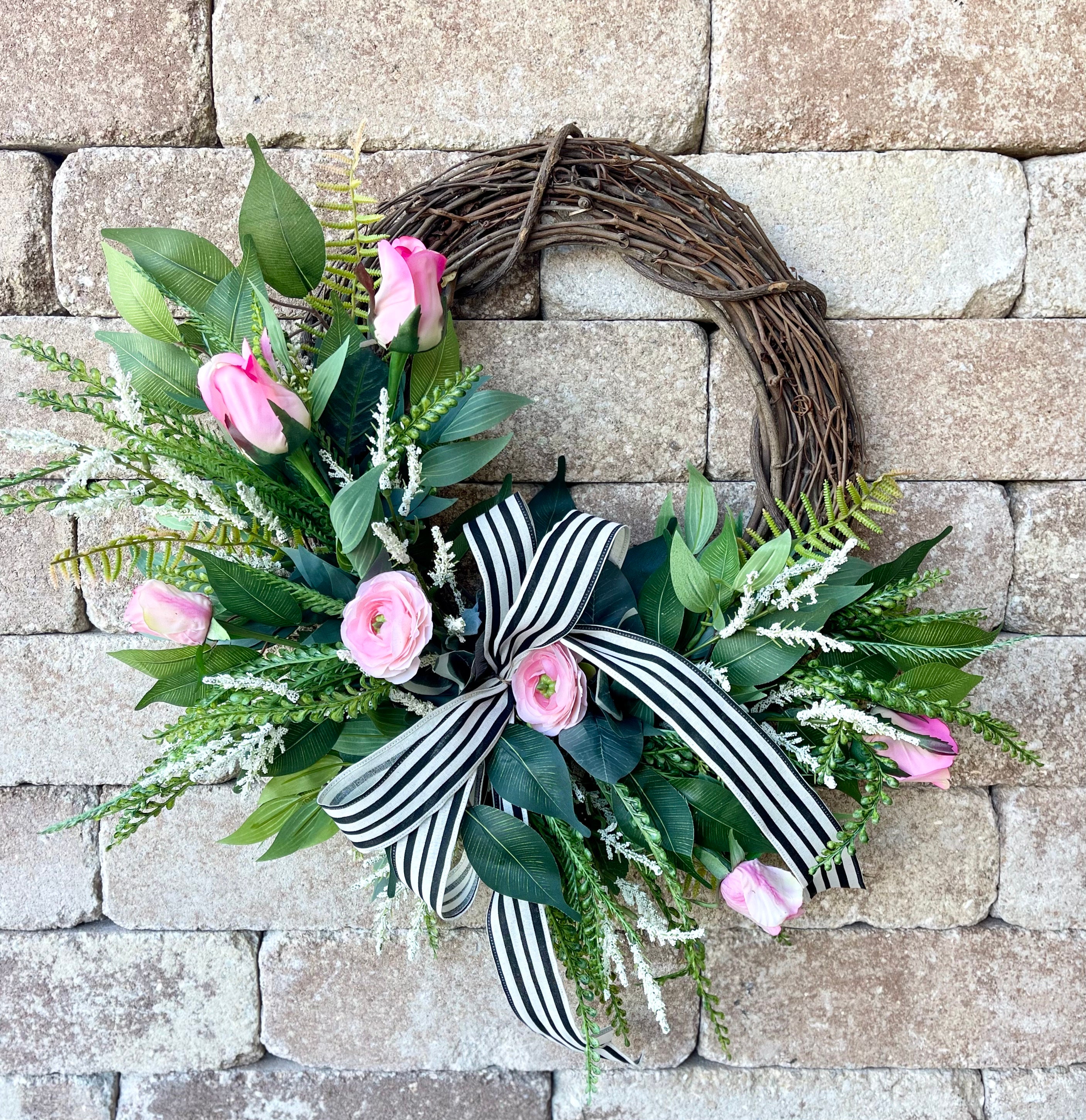 Celebrate love and elegance this Valentine’s Day with this stunning handmade wreath, featuring vibrant roses and ranunculus in your choice of romantic red or soft pink. Accented with delicate white berries, this wreath is the perfect way to welcome guests and set a festive tone for your home.