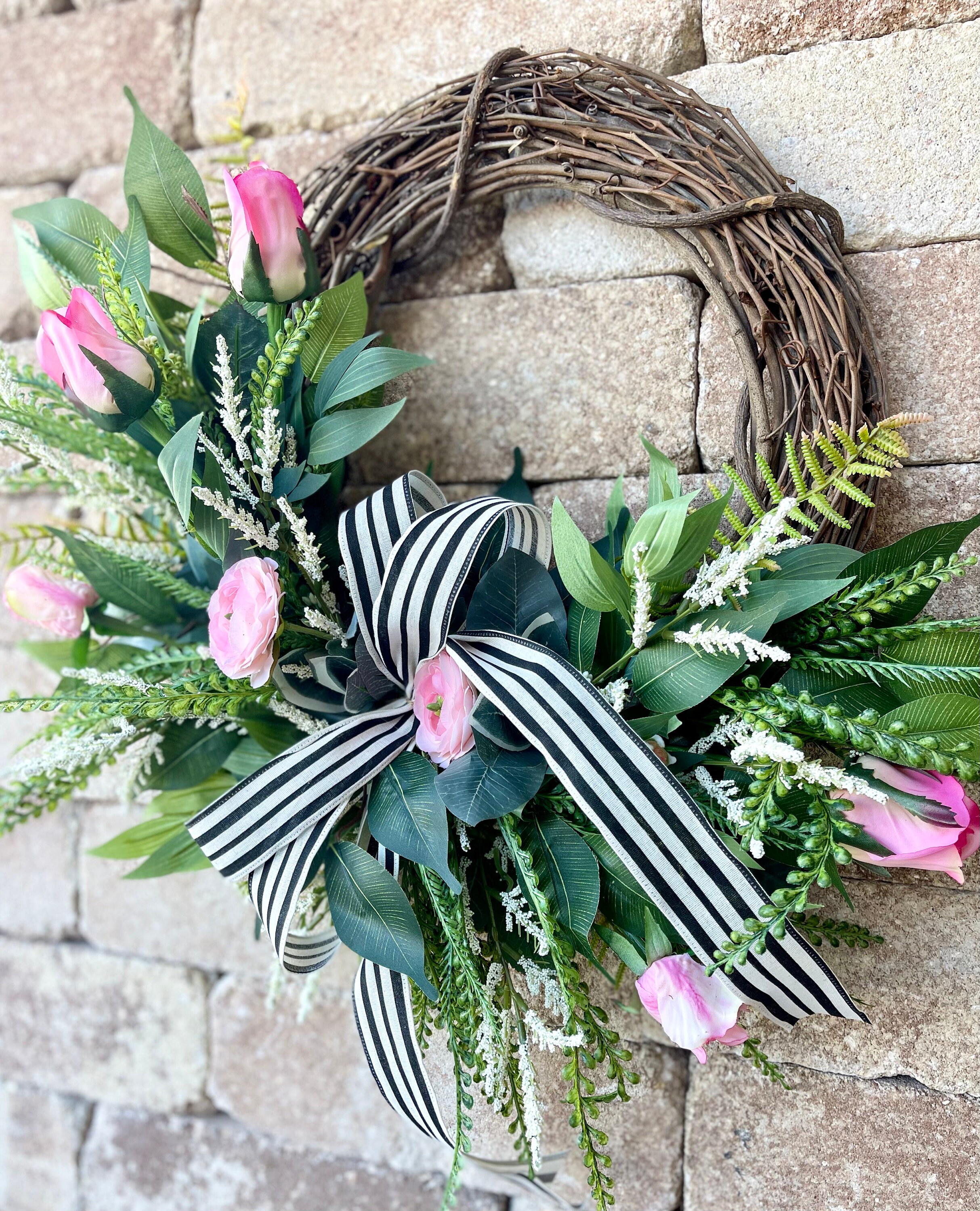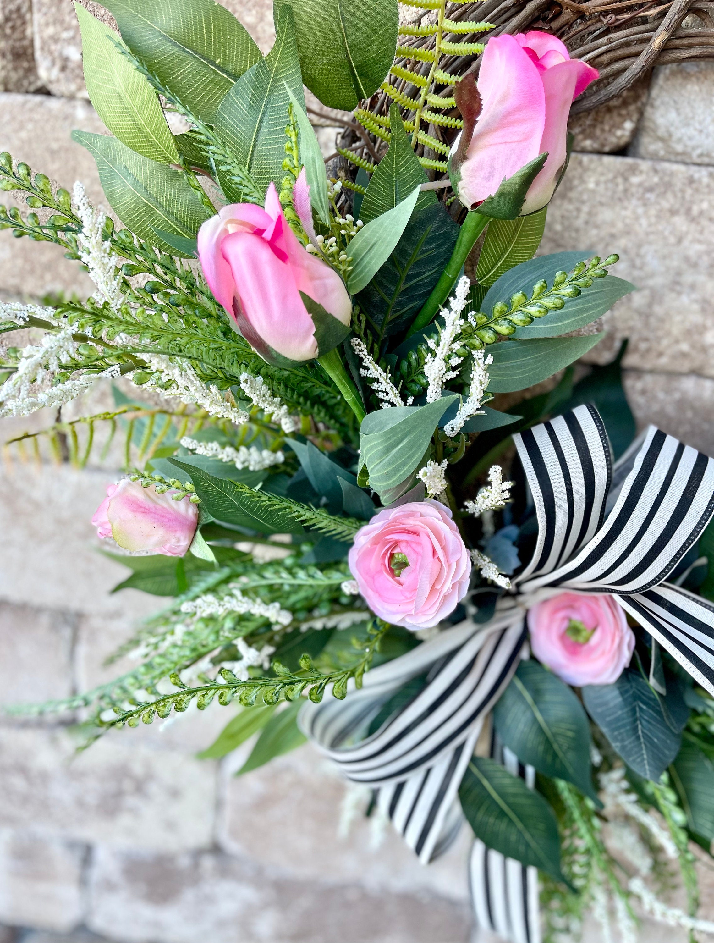 The design is tied together with a chic black-and-white striped bow, adding a touch of modern sophistication to the timeless floral arrangement.